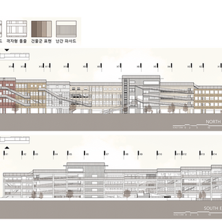 1. 기존 염천교 수제화 건물의 구조(기둥, 계단 등)와 외관 등을 재사용하고, 건물 뒤의 빈 부지에 공간을 확장함으로써, 과거와 현재가 공존하는 공간감을 형성한다